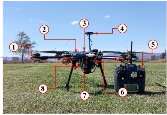 Hexacopter UAV platform with its main components: (1) brushless motor, (2) portable charger power bank, (3) flight controller, (4) GPS, (5) radio transmitter, (6) telemetry radio, (7) RGB and multispectral camera system, and (8) Li-Po battery.