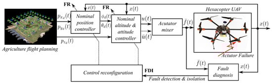 The rapid dynamics of hexacopter UAV systems pose a challenge for promptly detecting faults and reconfiguring the system before a crash occurs. Our interest is in validating in a simulation the feasibility of the proposed FTC algorithm for hexacopter UAV systems fulfilling a trajectory for precision agriculture. In order to achieve this goal, a Fault Reconfiguration (FR) scheme is proposed. Figure 4 presents the overall fault-tolerant control architecture for the hexacopter UAV system. The Fault Reconfiguration is applied exclusively to the vehicle experiencing actuator failure. This scheme consists of three main components: (i) the hexacopter UAV system, (ii) the nominal controllers, and (iii) the actuator fault diagnosis, which includes fault detection, isolation, estimation, and the reconfiguration system. To simplify the validation procedure, we have chosen a pole placement feedback controller with an integrator comparator as the nominal position controller, altitude, and attitude nominal controllers. These nominal controllers are used to show the effectiveness of the proposed fault-tolerant control scheme when an actuator of the hexacopter fails. The analysis of nominal controllers and actuator fault diagnosis is not within the scope of this work; additional information can be found in [27,28].