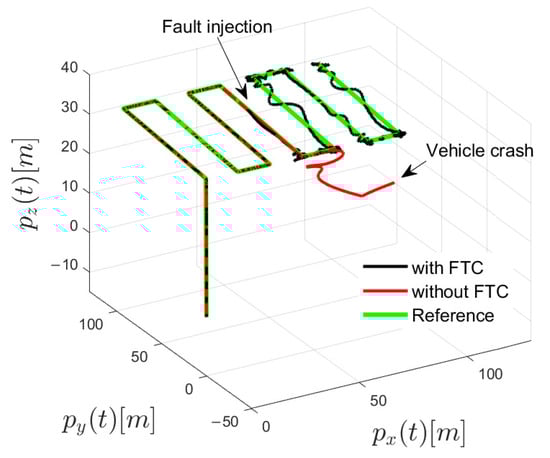 Three-dimensional position comparison of the faulty hexacopter with and without FTC.