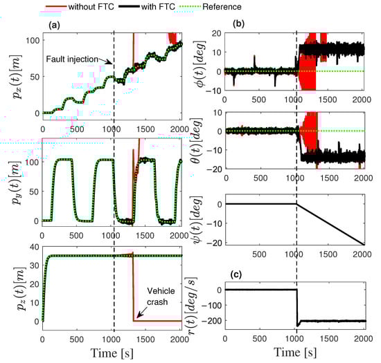 (a) Position, (b) Euler angles, and (c) yaw velocity of the faulty hexacopter utilizing FTC.