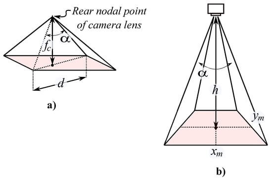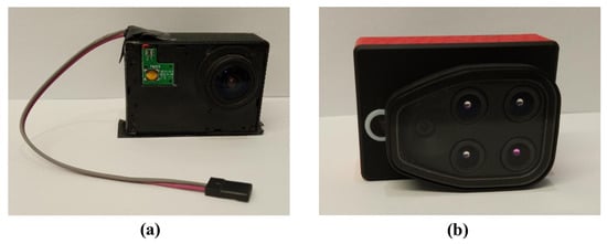 The SJ9000 camera used in this study was sourced from SJCAM, Shenzhen, China. The SJ9000 camera is chosen to collect the red–green–blue (RGB) imagining data because of the light weight and low cost of this type of camera (see Figure 8a). Low-cost action cameras, like a standard digital camera, have a Bayer color filter that allows capturing an RGB color image. The SJ9000 camera is equipped with an Aptina AR0330 CMOS sensor, the optical format is -inch, and the sensor size is 4.51 mm × 3.6 mm, defined as and , respectively. The image size of this camera is 4032 × 460 pixels, defined as and . The focal length of the digital camera is 2.55 mm.