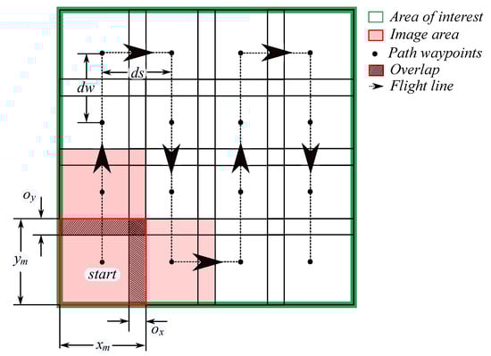 The experiments were conducted in Ameca Jalisco, Mexico, in August 2023. The flight planning and data collection were carried out experimentally by using the hexacopter UAV as shown in Figure 12. In this scenario, the vehicle performs a flight over the ethnobiological garden of Jalisco, located at the University of Guadalajara, Los Valles University Center. The area of interest is a rectangle with an area of 101 m × 104 m, as shown in Figure 13. The digital camera has an angular field of view deg. The maximum height the hexacopter can fly is m, with the horizontal distance between two horizontal points m and the vertical distances m. The percentage of overlap is specified to (see Figure 13). According to these values, the maximum speed that the vehicle can fly is m/s. The images are captured from the autopilot with a predefined time of s. Also, the images are georeferenced with the onboard GPS data. The flight planning is designed with the above parameters and programmed into the hexacopter UAV using the Mission Planner ground station.