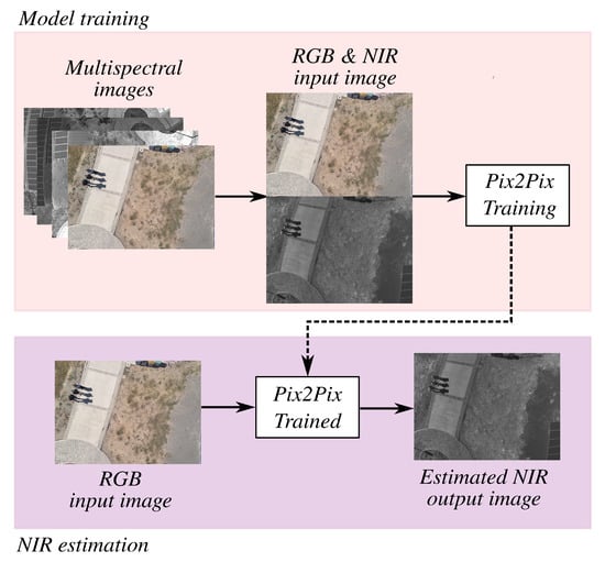 In this application, the real images are RGB-NIR samples. Initially, for training purposes, the RGB and NIR data were captured by the Sequoia multispectral camera. Once the training is complete, the input image is obtained from a low-cost RGB camera in order to validate the method for generating the NDVI map, as shown in Figure 11. This figure presents two main blocks: model training and NIR estimation. First, the multispectral images. Subsequently, only the real RGB and NIR images are extracted. These two images are then used to train the Pix2Pix neural networks. Once the system is trained, an input RGB image is applied to obtain the estimated output NIR image.