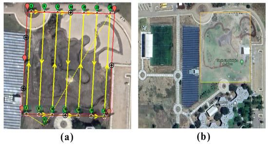 Scenario 1—Hexacopter flight planning: (a) from the software Mission Planner version 1.3.77, (b) showing the area of interest from Google Maps.
