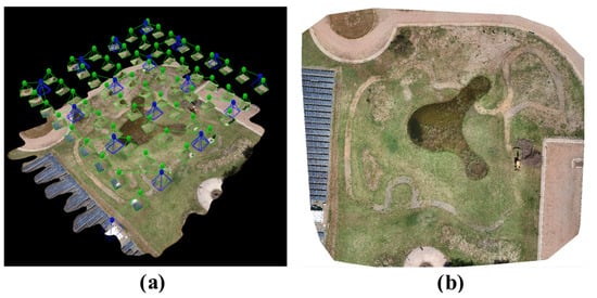 Scenario 1—Orthomosaic: (a) showing the images captured with the hexacopter UAV, (b) generated by PIX4D mapper.
