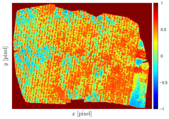 Furthermore, in Figure 18, the orthomosaic and the NDVI created from the estimated NIR applied to a sugarcane crop are presented. These experiments were conducted in Ameca, Jalisco, Mexico, during May 2023. In this experiment, a flight was performed over a sugarcane crop at the tillering stage. The area of interest is 1916 m2. Table 6 presents the NDVI values depending on the object type. It can be observed that areas close to 1 indicate dense vegetation, while areas close to 0 indicate bare soil or areas with little vegetation. The average NDVI value in the sugarcane planting area is , indicating the tillering stage. The growing stages of the 12-month cycle of sugarcane are as follows: germination with a mean NDVI value of 0.35–0.4; tillering: 0.4–0.65; grand growth: 0.65–0.7; and ripening: 0.65–0.3 [42]. As a result, in Figure 18, we can identify the areas that require additional attention or intervention. These interventions may include targeted fertilization, irrigation adjustments, or pest and disease management to improve the overall health and yield of the sugarcane crop.