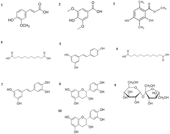| 10 | 577.1339 | 577.1346 | −1.2 | 0.7 | 10.20 | C30H24O12 | Phenolic (flavonoid) | Procianidin a |