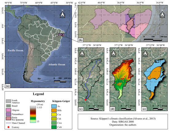 Location of the study area [37]. (a) Continental and national delimitation; (b) state delimitation and Ipanema River Basin; (c) delimitation of the main bed of the Ipanema River and identification of its mouth; (d) hypsometry based on the shuttle radar topography mission (SRTM) digital elevation model (DEM), with a spatial resolution of 30 m; (e) Köppen-Geiger climate classification of the Ipanema River Basin (IRW), Pernambuco and Alagoas, Brazil.