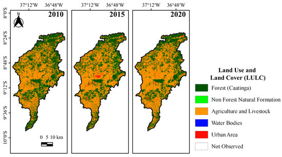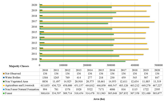 Between 2013 and 2015, the Northeast Region showed an annual growth in the agricultural sector of approximately 3374 ha, followed by a reduction in the native forest of the Caatinga Biome [9,70], which is considered one of the most threatened by environmental degradation due to the predominance of the semiarid climate [10]. Figure 4 shows the Land Use and Land Classes (LULC) and Figure 5 shows the quantification of the area in hectares (ha) for the period from 2010 to 2020. An inverse relationship was observed between the Forest and Agriculture and Livestock classes; forested areas (Caatinga) decreased over time, while agricultural areas increased.