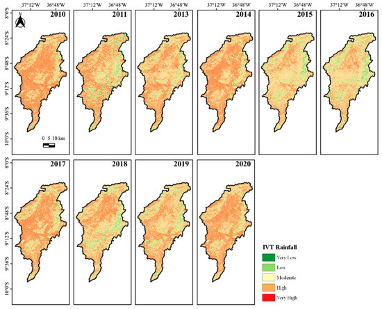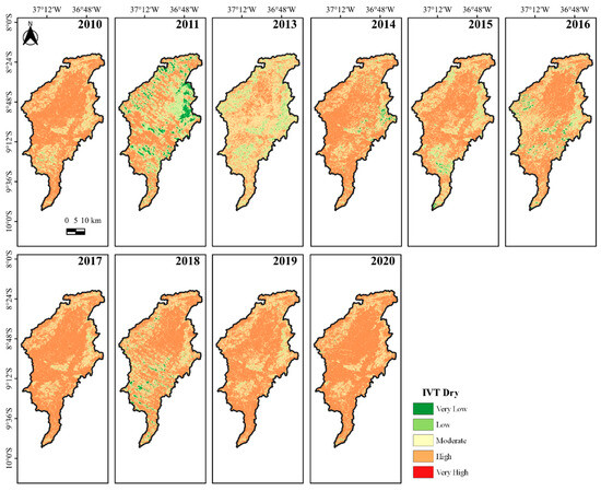 The Vegetation Vulnerability Index (IVV), also developed by Chaves et al. [61], was estimated by calculating the difference between the IBVL for a hypothetical scenario of maximum preservation and the actual condition of the vegetation being evaluated, according to Equation (2).