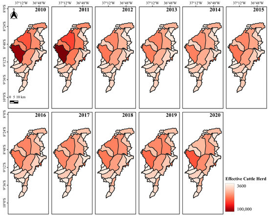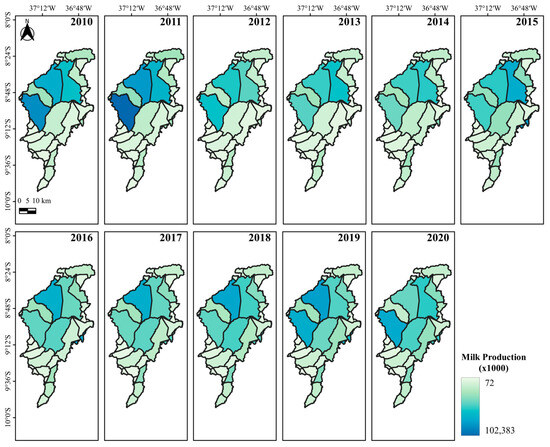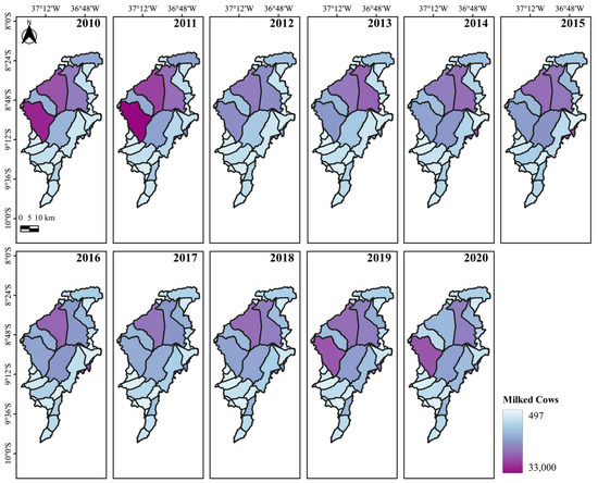 In this way, a survey was carried out to quantify the Effective Herd (EH), Milked Cows (MC), and Milk Production (MP) in each of the 34 municipalities studied in the 2010–2020 period using the Municipal Livestock Survey (PPM) database from the Automatic Recovery System (SIDRA) platform of the Brazilian Institute of Geography and Statistics (IBGE) via the following email address: https://sidra.ibge.gov.br/pesquisa/ppm/quadros/brasil/2021 (accessed on 20 October 2022).