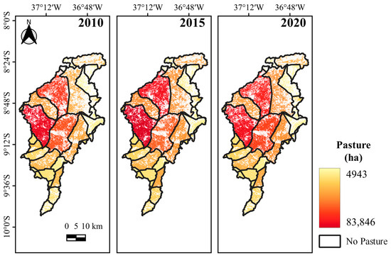 Pasture data for the study region were extracted from the Pasture Atlas platform of the Image Processing and Geoprocessing Laboratory of the Federal University of Goiás (PAPIG/UFG). The data are available at: https://atlasdaspastagens.ufg.br/map (accessed on 20 October 2022).