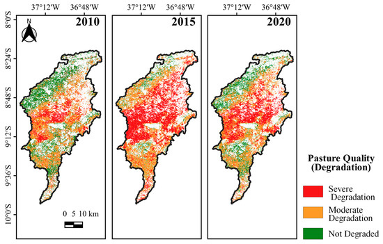 The raster files were processed in QGIS 3.22 and the thematic maps were produced and classified into three main classes: severely degraded, moderately degraded, and not degraded.