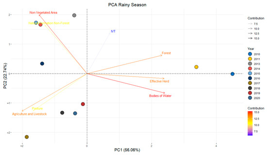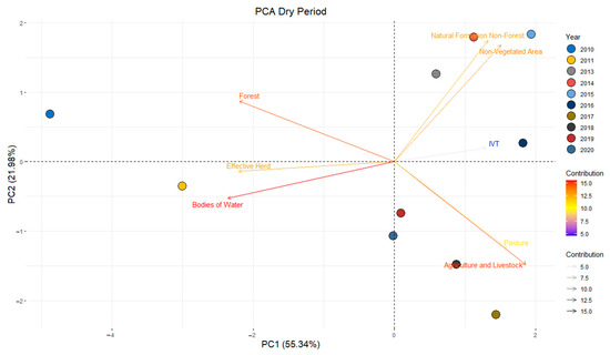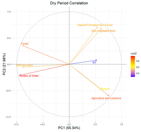 Principal component analysis (PCA) was carried out using the variables LVI, MapBiomas classes (5 classes), number of livestock, and pasture in the dry and rainy periods, for the series from 2010 to 2020. Based on the principal components (PC), the covariance matrix was obtained to extract the eigenvalues that originate the eigenvectors. The Kaiser criterion was used to identify the variables that showed correlation, considering eigenvalues greater than 1.0, which generate components with a relevant amount of information contained in the original data [67,68].