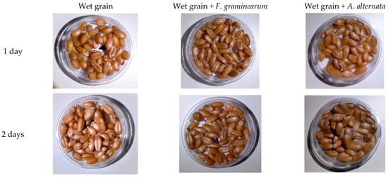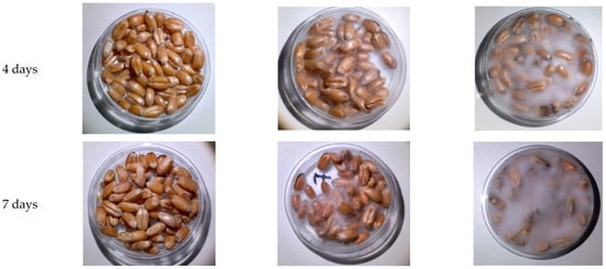Photographs in Figure 1 depict control wet wheat seeds and wet wheat infected with fungi after 1, 2, 4, and 7 days of incubation in the second experiment. Visual inspection revealed the presence of fungal mycelium on the surface, notably for F. graminearum on day 4 and for A. alternata on day 2 (see Figure 1). In the first and third experiments, the presence of A. alternata mycelium was visible only on day 4 (results not shown). These data indicate that additional methods for the early diagnosis of wheat seeds are needed, as conventional imaging methods are inconclusive during the first days of infection.