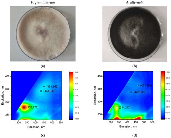 Cultures of F. graminearum (a) and A. alternata (b) in plastic Petri dishes (diameter 9 cm). Typical EEMs of fungal cultures F. graminearum (c) and A. alternata (d). The spectrofluorometer settings were the same for all measurements (see “Supplementary Materials”). Asterisks on EEMs denote peaks indicating emission and excitation wavelengths.