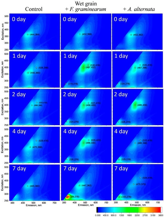 Figure 3 displays averaged (over three experiments or 5–9 independent samples) EEMs of wet wheat (control) and wheat infected with F. graminearum and A. alternata on days 0, 1, 2, 4, and 7 after inoculation. The EMMs reveal discernible differences in spectra as early as the first hours and days after infection. In wheat infected with A. alternata and F. graminearum, the peak maximum after 2–3 h (0 day) shifts from the λem = 444/λex = 364 nm area to the λem = 452/λex = 362–366 nm area and to the λem = 487/λex = 398–402 after 1 day. This shift is likely attributable to chitin in cell walls and metabolites of fungi resulting from their growth on wheat []. Intriguingly, fluorescence from the fungal cultures of F. graminearum and A. alternata did not exhibit peaks in the λem = 486/λex = 400 region (Figure 2). The closest peaks were observed at λem = 451/λex = 360 nm for F. graminearum and λem = 463/λex = 364 nm for A. alternata (Figure 3).