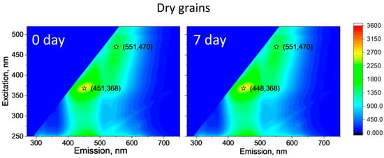 A similar pattern was observed for the control wet wheat grains. There, the position of the main peak also changes. There is a shift from λem = 440/λex = 360 nm from the start of the experiment to λem = 486/λex = 398 nm on day 2 (Figure 3). The peak then reverts back to λem = 445/λex = 360 nm on day 7. This may indicate that some fungi may also grow on the control wheat in a small amount, but this is not the case. Characteristically, no such changes were recorded for dry wheat grain. The EMMs did not change during the whole experiment (Figure 4). It should be noted that the spectra for dry wheat grains were much higher in intensity than the spectra of wet grains. This is due to the quenching of emission of fluorescence by water, especially in the visible and not ultraviolet region.