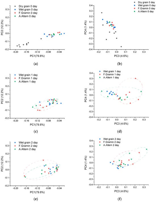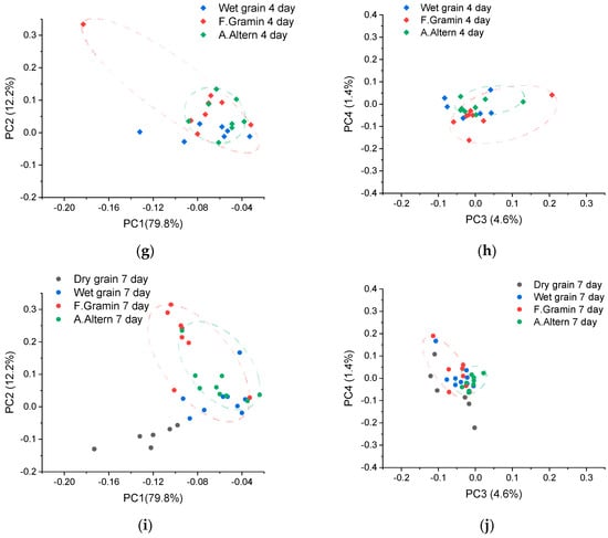 Results of PCA for dry (day 0 and 7) and wet wheat and for wheat infected with F. graminearum and A. alternata at 0 (few hours, (a,b)), 1 (c,d), 2 (e,f), 4 (g,h), and 7 (i,j) days after infection. Results for PC1 and PC2 are shown on the left and for PC3 and PC4 on the right. The areas of control (blue), F. graminearum (red), and A. alternata (green) infected samples are marked with ellipses. Ellipses were constructed for the purpose of visualisation so that all points of the corresponding group were inside them.