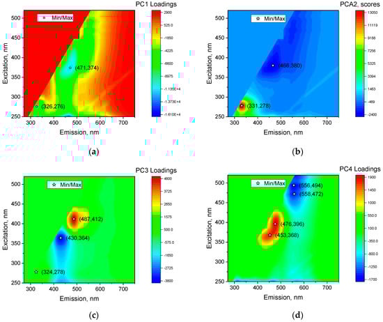 To use principal component analysis (PCA), the emission–excitation matrices were transformed into a single column. The Nipals (Nonlinear Iterative Partial Least Squares) algorithm [] was then used with the following parameters: number of principal components—4, maximum number of iterations—104, data scaling—‘noscale’, convergence accuracy—10−10. To represent the loading matrices, the inverse was performed from the column to obtain the emission–excitation matrix for loading values.