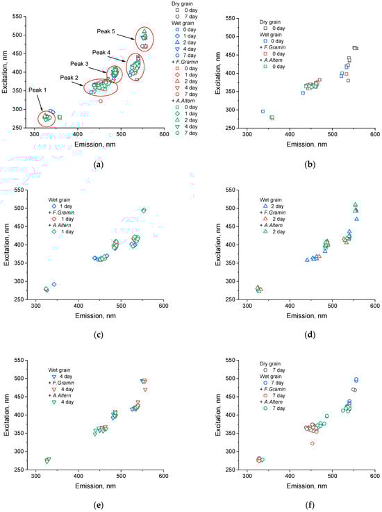The peaks of each measurement of EEMs depict wet wheat and wheat infected with F. graminearum and A. alternata for all days (a), on day 0 (b), day 1 (c), day 2 (d), day 4 (e), and day 7 (f) following infection. Consistency was maintained across all measurements with identical spectrofluorometer settings.