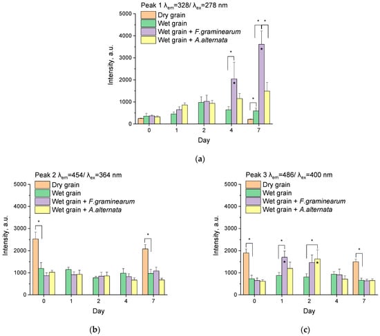 As can be seen from the figure (Figure 7a), peak 1 has an average location λem = 328/λex = 278 nm. This is the only peak for which the substances reliably identified are proteins and amino acids (Table 1). Nearby peaks (e.g., λem = 360/λex = 280 nm), which were observed in the first days of the experiments (Figure 7b,c), in some experiments may belong to lignins (Table 1, []). Peak 1 appears on the samples of the first and subsequent days and is mainly formed by fungus-infected samples (Figure 7c–f). Analysis of intensity changes at λem = 328/λex = 278 nm showed that there is a sharp increase in intensity on the first day in samples infected with A. alternata, and by day 4–7 in samples with F. graminearum (Figure 8a), with the increase in the latter being statistically significant (p < 0.05, Two-way ANOVA with Tukey’s Test). The intensity of uninfected dry samples does not change during the week of the experiment, whereas in the control wet samples, there is an increase up to day 2 and a slight drop, which may indicate a possible infection of the control samples. F. graminearum samples at day 7 also were significantly different from A. alternata samples (p < 0.05, Two-way ANOVA with Tukey’s Test).