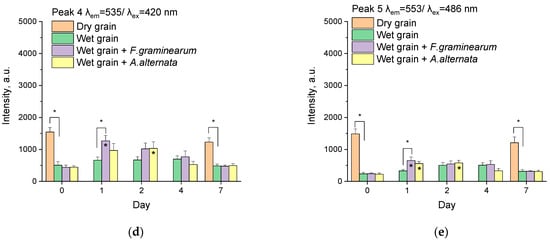 The fluorescence intensities of the peaks on different days after infection with phytopathogen for dry wheat grains, wet wheat grains (control), and wheat grains infected by A. alternata and F. graminearum. The peaks are located in λem = 328/λex = 278 nm (a), λem = 454/λex = 364 nm (b), λem = 486/λex = 400 nm (c), λem = 535/λex = 420 nm (d), and λem = 553/λex = 486 nm (e). Intensities of the peaks are averages of 5–9 independent measurements in 3 experiments. Standard errors of mean are set as an error. The spectrofluorometer settings were the same for all measurements. * (above column)—the difference between this group and wet grain in same day at this time (p < 0.05, Two-way ANOVA with Tukey’s Test). * (inside column)—the difference between this group and the group in the same category on day 0 (p < 0.05, Two-way ANOVA with Tukey’s Test).