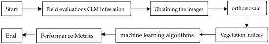 To detect CLM infestation using a remotely piloted aircraft, infestation data were first collected from identified plants, and then a flight was performed. Vegetation indices were calculated from the orthomosaic generated. Machine learning algorithms were used from this database and compared using performance metrics (Figure 1).