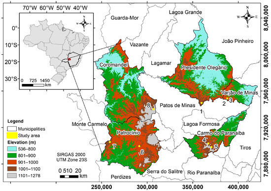 The study was carried out on eight farms situated in the municipalities of Coromandel, Presidente Olegário, Varjão de Minas, Carmo do Paranaíba, and Patrocínio in the State of Minas Gerais, Brazil, within the Cerrado Biome (Table 1, Figure 2). In each study area, a plot with 0.28 ha of coffee (Coffea arabica L.) was selected.