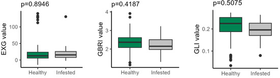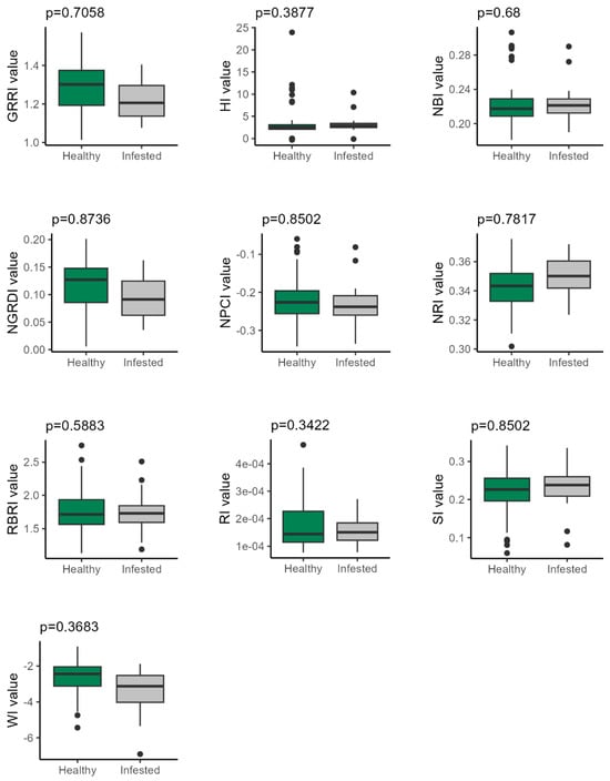 For all indices, the p-value was greater than 0.05, suggesting no significant difference in the means between the infested and healthy plants (Figure 3).