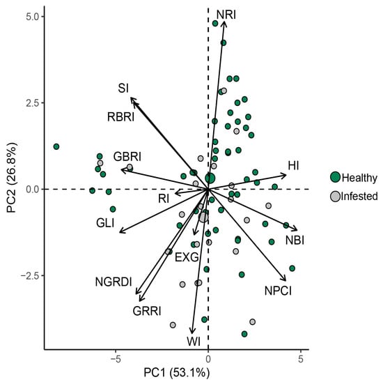 The entire dataset of vegetation index and coffee leaf miner infestation was analyzed by principal component analysis (PCA) (Figure 4). The PCA diagram shows the relationship among the different vegetation indices and the two plant states (infested and healthy).