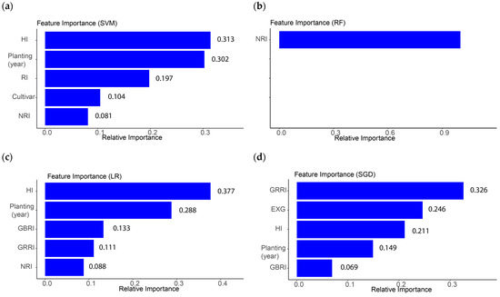 Apart from the vegetative indices, the age of the plants and the cultivar were the most significant variables for the machine learning models (Figure 5). Plant age was the non-vegetative index that presented significant importance, reaching 30% in the SVM models and 28% in the LR. The vegetative index HI presented the best performance in the models presented. The RF model selected only the NRI index.