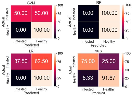 The RF algorithms were unable to identify plants with CLM infestation. All predictions from the RF algorithm indicated that the plants were not infested with CLM. The SGD algorithm showed the best performance in identifying the infestation, followed by the SVM algorithm, with 75% and 50% accuracy in identifying plants with infestation, respectively (Figure 6).