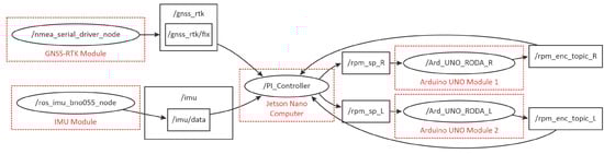 The robotic platform embedded software, version 1.0, was developed using the robotic operation system (ROS) framework in its melodic version. The ROS core ran on the Nvidia Jetson Nano, which in turn communicated with two Arduino UNO R3 boards using the Rosserial library (update rate of 10 Hz) with the GNSS-RTK Rover module (update rate of 5 Hz) and the IMU sensor (update rate of 10 Hz). As illustrated in Figure 2, the ROS-based software is organized into nodes (ellipses), topics (rectangles), and services. Arrows represent the flow of data, in which data can leave a node (publisher) and be published on a topic, just as data can leave a topic and be received by a node (subscriber).