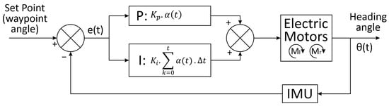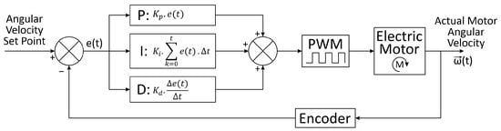 The angular velocity of the robotic platform’s wheels was controlled using software running on Arduino UNO R3 boards. In this software, a proportional-integral-derivative (PID) controller was implemented (Figure 3), which acted on the electric motors by varying their average supply voltages using pulse-width modulation (PWM) and changing their angular velocities. The values of 10, 20, and 0.1 were used for Kp, Ki, and Kd, respectively, and were adopted in the two-wheel controllers. To reach these values, the Ziegler and Nichols method was used, followed by fine-tuning through trial and error.