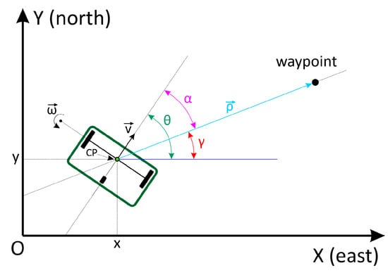 In Figure 4, CP is the control point, located at the average distance from the virtual axis that connects the center of the two wheels, (x, y) is the Cartesian position of the CP, is the forward velocity, is the angular velocity of the robotic platform, is the vector that connects the current location to the waypoint, is the distance between the current location and the waypoint (m), is the angle of the vector with respect to the X axis (east), is the angle of the robot’s direction of travel with respect to the X axis (east), and , which is the orientation error to the waypoint.