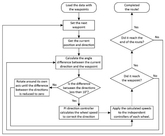 The robotic platform was considered to reach the waypoint when (Figure 4) was less than 0.5 m. Additionally, the control algorithm was implemented to ensure that, after navigating through all the waypoints on the planned route, the platform would return to the starting point. Figure 6 shows a flowchart of the software developed for the robotic platform.