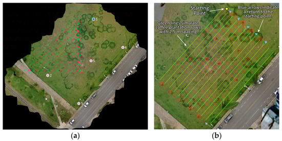 A flat rectangular field measuring approximately 1600 m2 was used. The field is cultivated with lawn grass (Paspalum notatum). The zebra-marking tape was fixed to the ground, simulating lines of a coffee farm with a spacing of 2.5 m and a length of 40.0 m each. The area was mapped using images obtained using a DJI Mavic Air 2 UAV operating at an altitude of 20 m. Images were processed to obtain orthophotos in the field. For correct orthomosaic georeferencing, the geographic coordinates of the five control points were collected using the GNSS-RTK module of the robotic platform (Figure 7a). Point 1 (blue) had its coordinates obtained on average without using the GNSS-RTK base module, owing to the absence of a reference point. To obtain the other four points, the base module was fixed at point 1, with its coordinates as a reference. QGIS software version 3.32.2 was used to trace the route to be followed by the robotic platform (Figure 7b).