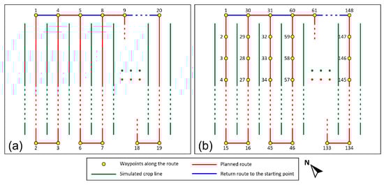 Strategies for generating routes used to evaluate platform performance. (a) waypoints allocated at the vertices of the route (Test 1). (b) waypoints allocated along route lines every 3 m (Test 2).