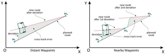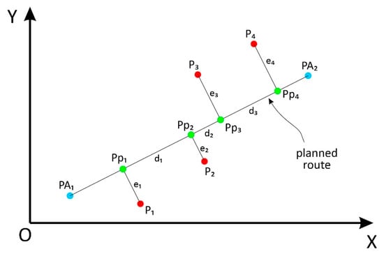 The navigation performance assessment of the robotic platform involved calculating and analyzing the lateral deviation (called the cross-track error) of the platform in relation to the planned route segment. The position data of the robotic platform obtained by the GNSS-RTK module and stored in a CSV format file were used. As illustrated in Figure 9, the parameters of the straight-line equation were analytically calculated for each route segment formed by waypoints PAi and PAi+1. For each position of the robotic platform (Pj), the parameters of the equation for the line perpendicular to , which also passes through point Pj, were calculated analytically. Using the two straight-line equations, the intersection point was Ppj, which is the orthogonal projection of the crossed point Pj on the line segment . The cross-track error ek corresponds to the distance between Pj and Ppj, which is the orthogonal distance between the position of the robotic platform and planned route segment .