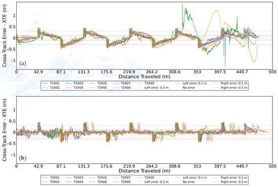 Variation in cross-track error depends on the distance traveled during the execution of the planned routes. (a) Test 1. (b) Test 2.