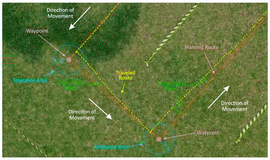 The magnitudes of the cross-track errors observed in the peaks and valleys, occurring during the maneuvers, are explained by the tolerance in the minimum value of adopted (0.5 m), considering that the robotic platform reached the waypoint (Figure 12). The adoption of a minimum value higher than null was necessary because of oscillations in the position determination of the robotic platform by GNSS-RTK, ensuring that the robotic platform did not get stuck around the waypoint when attempting to cancel [10]. Thus, near the maneuvering region, the robotic platform does not need to arrive exactly at the waypoint. The tolerance value can be reduced to reduce the peaks and valleys of the cross-track errors presented in this study. However, this value must exceed the amplitude of the position oscillations obtained using GNSS-RTK.