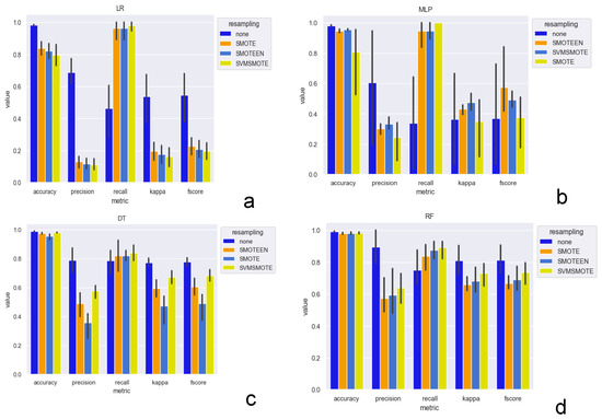 Performance metrics of ML models from data with resampling techniques: Models tested were LR (a), MLP (b), DT (c) and RF (d).
