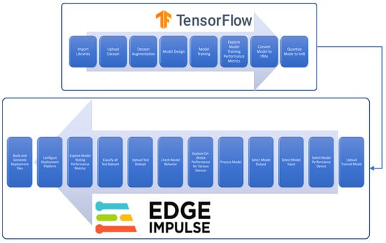 To address the challenges of real-time tomato leaf disease detection in agricultural settings, we developed a comprehensive and well-structured methodology that integrates deep learning techniques with edge computing capabilities. Our approach ensures high model accuracy and guarantees efficient real-time performance in resource-constrained environments, such as the fields where these systems will be deployed. By leveraging TensorFlow for model training and Edge Impulse for streamlined deployment (Figure 1), the methodology is designed to enable models to perform real-time inference on edge devices without relying heavily on cloud infrastructure.