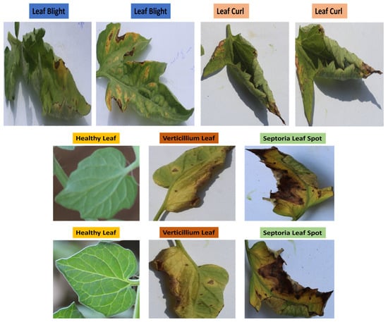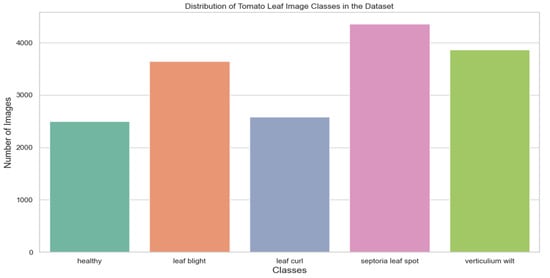 The dataset for training the deep learning models was a comprehensive collection of tomato leaf images meticulously curated by P. K. Mensah et al. []. Originally collected from local farms in Ghana, this dataset represented various tomato leaf disease states and healthy conditions. The varieties of tomatoes used included Cherry, Techiman, Petomech, Power Rano, and Jaguar F1 tomatoes. We focused exclusively on the tomato portion of the dataset, which comprised a total of 5435 raw images, further augmented to create 27,178 images categorized into multiple disease classes. Sample images of the dataset can be seen in Figure 3. For this study, we selected a subset of 16,947 images categorized into five specific classes: Healthy (2500 images), Leaf Blight (3645 images), Leaf Curl (2582 images), Septoria Leaf Spot (4356 images), and Verticillium Wilt (3864 images). Figure 4 shows the distribution of the images in the dataset.