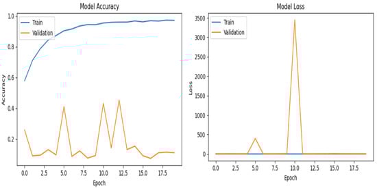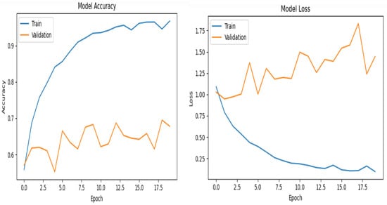 MobileNet demonstrated strong performance during training, achieving a high training accuracy of 96.78% and a low training loss of 0.0969, as shown in Figure 12. However, the validation accuracy significantly dropped to 67.78%, with a corresponding validation loss of 1.4442. The discrepancy between the training and validation performance suggests that MobileNet may be overfitting the training data, as it struggles to generalize to the validation set. Despite its relatively modest 3.40 MB and efficient training time of 11,306.58 s, MobileNet’s generalization capabilities might require further tuning or regularization techniques.