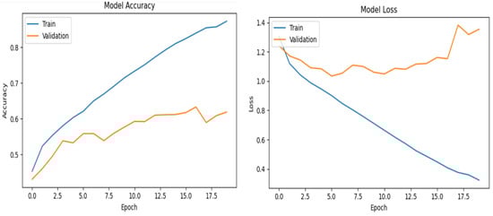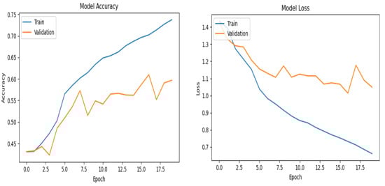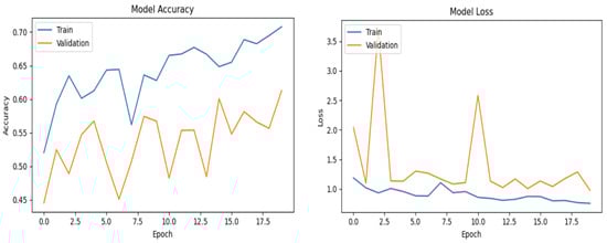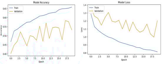 Inception achieved a moderate training accuracy of 70.77% with a training loss of 0.7563. The validation accuracy was 61.25%, with a validation loss of 0.9778, indicating a somewhat balanced performance between the training and validation sets, as shown in Figure 13. However, the % test accuracy of 61.28% aligns closely with the validation results, suggesting that Inception is less prone to overfitting than MobileNet, but still falls short in overall accuracy. The large model size of 21.40 MB and longer training time of 9532.55 s reflect the model’s complexity, which may not be ideal for resource-constrained environments.