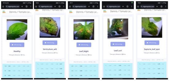 As illustrated in Figure 19, the deployed model on a mobile telephone accurately identifies and classifies the various tomato leaf diseases. This successful prediction highlights the model’s capability to distinguish between different health conditions of tomato leaves.
