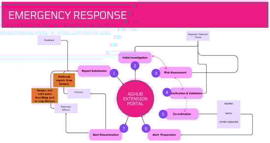 In collaboration with other relevant government agencies, PPRSD develops comprehensive response strategies. These strategies include recommendations and mitigation measures, which are then communicated to farmers and other stakeholders through the AGHUB EXTENSION PORTAL and other available channels. The various steps involved in an emergency response scenario are illustrated in Figure 20.