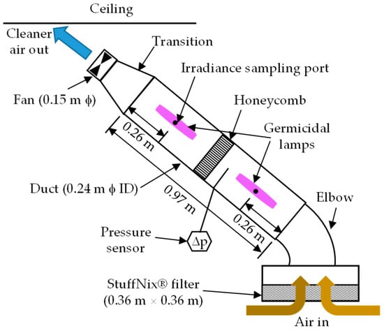 The prototype is shown in Figure 1. Nursery air was drawn in through the StuffNix® filter (0.36 m × 0.36 m) housed in a galvanized square-to-round transition. After partial filtration, the air entered the treatment section or the aluminum duct (0.97 m × 0.24 m ϕ ID). In the treatment section, the air was irradiated by two low-pressure, self-ballasted CFL25 germicidal lamps (LSE Lighting, Worchester, UK; total output: 25 W; UVC output: 7.5 W; life: 7000 h) in line with the airflow (Figure 1) and located in the center of the duct. Two 12.7 mm thick aluminum honeycomb panels were placed together mid-length of the treatment section (Figure 1). The inner surface of the duct and honeycomb, with a total surface area of ~1.38 m2, was coated with TiO2 at 0.2 g·m−2 by PURETi, LLC (Cinncinnati, OH, USA), a manufacturer of photocatalytic coatings, free of cost. The irradiated air was exhausted by a 0.15 m variable speed DC fan (EBM-Papst, Mulfingen, Germany; model: 6424 H; 0.134 m3·s−1 at 0 Pa). The fan airflow rate was controlled using a voltage regulator. A pressure tap approximately mid-way between the top of the lower lamp and honeycomb was connected to the low-pressure port of a DM-2003-LCD differential pressure transmitter (DPT) (Dwyer Instruments, Michigan City, IN, USA; range: 0–125 Pa; accuracy: ±1% full scale) with an LCD display to measure pressure drop (Δp). The high-pressure port of the DPT was exposed to room air but was sheltered from drafts. As discussed in Section 2.3, the treatment section of the air cleaner was inclined due to the nursery ceiling height.